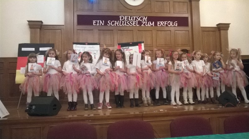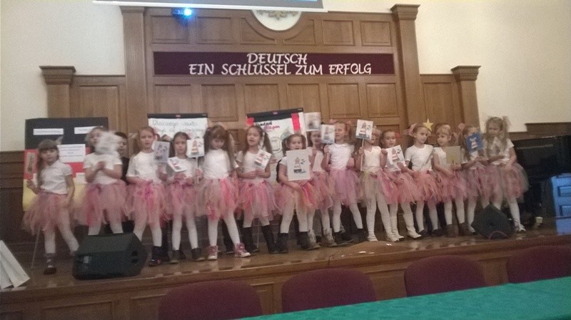 W środę, 12 listopada uczniowie klasy 1b wystąpili podczas Dnia Języka Niemieckiego zorganizowanego w auli Liceum Ogólnokształcącego w naszym mieście. Projekt ph. „Deutsch- ein Schlüssel zum Erfolg” przygotowali nauczyciele j. niemieckiego turkowskiego liceum. Dzieci z klasy 1b są uczniami klasy dwujęzycznej, stąd idea ich występu. Wykonały piosenkę w j. niemieckim „Ich gehe mit meiner Laterne (Idę ze swoją latarnią). Piękne stroje oraz przygotowane do występu rekwizyty zrobiły wrażenie na gościach zgromadzonych w auli. Po udanym występie, nagrodzone gromkimi brawami dzieci wzięły udział w niezwykle interesujących warsztatach z języka niemieckiego w ramach projektu Instytutu Goethego: „Deutsch Wagen Tour”. Cieszy nas fakt, że uczniowie w naszej szkole już od pierwszej klasy mają możliwość „oswajania się” z językiem naszych zachodnich sąsiadów.
