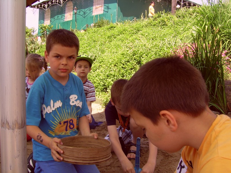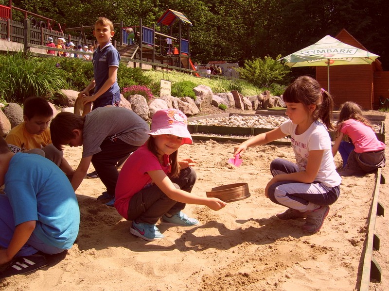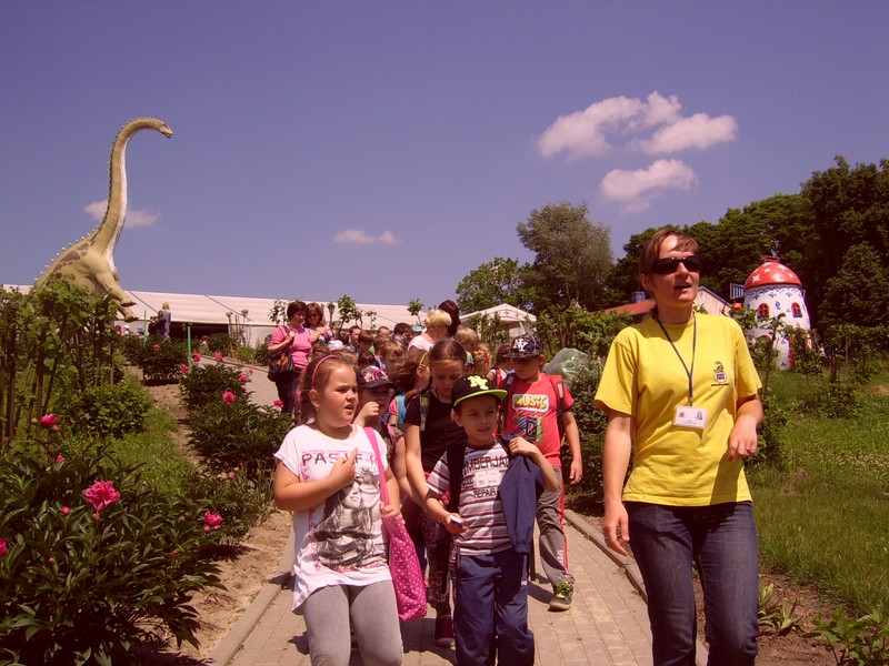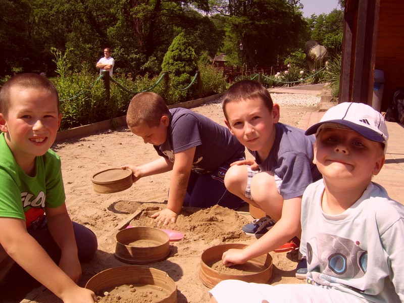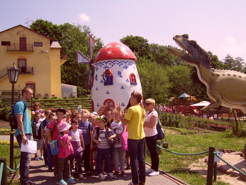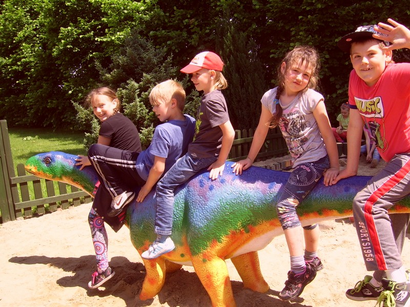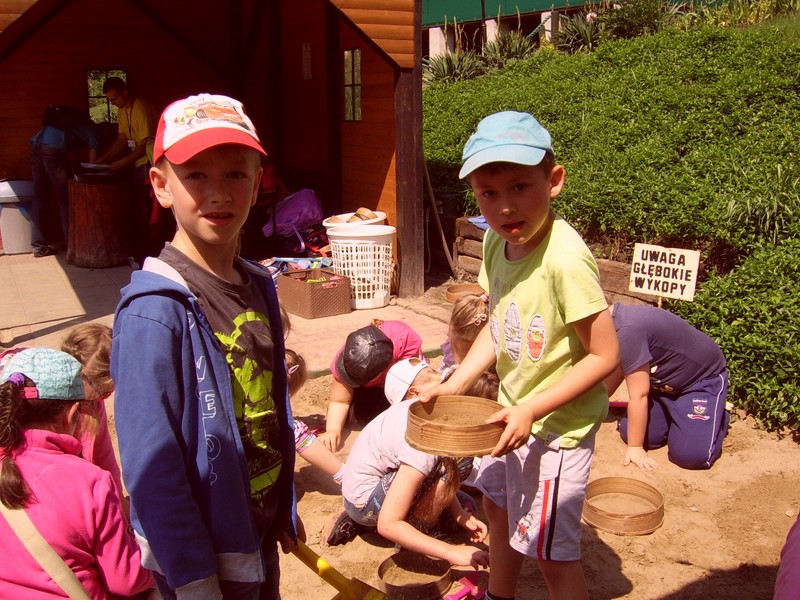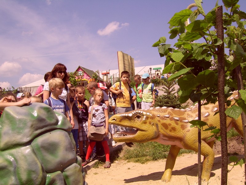W czwartek tj. 05.06.2014 r. uczniowie z klas 1a i 1c pojechali na wycieczkę do Kołacinka. Po powitaniu przez przewodników Parku Jurajsko- Botanicznego dzieci wraz z wychowawczyniami udały się na poszukiwanie drobinek złota za pomocą specjalnych sit. „Gorączka złota” trwała dość długo, a prócz złota można było znaleźć także zęby dinozaura lub inne ciekawe rzeczy. Następnie uczestnicy wycieczki udali się na spacer po parku. Przewodnik oprowadzał dzieci po ścieżce ery mezozoicznej, zapoznając ich z różnymi gatunkami żyjących w dawnych czasach dinozaurów, opowiadał o warunkach i życiu tych zwierząt. Dla dzieci bardzo interesujące było to, iż mogły zobaczyć eksponaty dinozaurów, dotknąć je oraz zrobić sobie z nimi zdjęcia. Następnym punktem programu było zwiedzanie wystawy geologiczno – paleontologicznej oraz fotograficznej dotyczącej również życia dinozaurów. Ciekawą atrakcją dla małych uczestników był przejazd bajkową kolejką. Po spożyciu posiłku na terenie parku i chwili relaksu dzieci udały się na plac zabaw, gdzie czekało na nich wiele atrakcji typu: kolorowe piłki, zjeżdżalnie, tunele, drabinki, mostki i różnego rodzaju gry. Bardzo ciekawy dla dzieci okazał się pobyt w piaskownicy gdzie własnoręcznie przy pomocy szpadelków mogły odkopać ukryty szkielet dinozaura. Mogły także zrobić zdjęcie z eksponatem dinozaura. Po wielu atrakcjach przyszedł czas na powrót do domu a drogę powrotną umilały dzieciom piosenki i wspaniała atmosfera. Zwieńczeniem wycieczki było wręczenie uczniom „małym poszukiwaczom złota” dyplomów oraz złotej pamiątkowej monety.