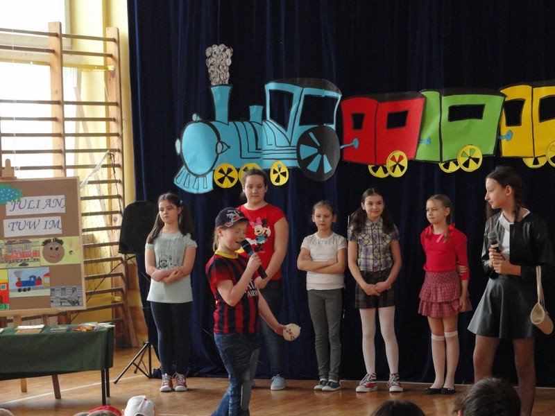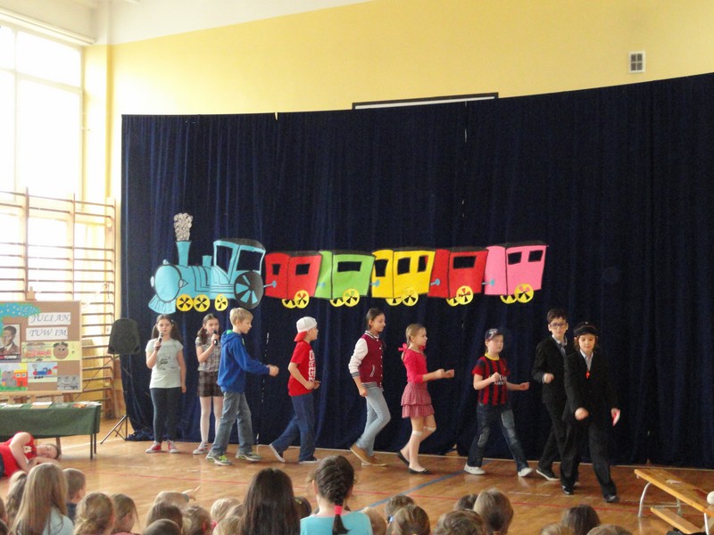 Najmłodsi członkowie zespołu „Iskierka” przygotowali dla uczniów klas I-IV oraz dla zaprzyjaźnionej grupy przedszkolnej Przedszkola Samorządowego nr 3 w Turku spektakl teatralny pt. „Pasażerowie z Lokomotywy”, którego scenariusz powstał na podstawie fragmentów wierszy Juliana Tuwima. Na scenie pojawiły się znane wszystkim postacie – pan Hilary, Zosia Samosia, niegrzeczny Grześ i jego ciocia, a także sam poeta, Julian Tuwim, którego niezwykle przekonywująco zagrała Marcelina Sobczak, uczennica kl. Vb. W scenie finałowej maszynista poprowadził lokomotywę do Tuwimowa, a Zosia Samosia (Aleksandra Ziętek) zaśpiewała piosenkę „Fantazja”.